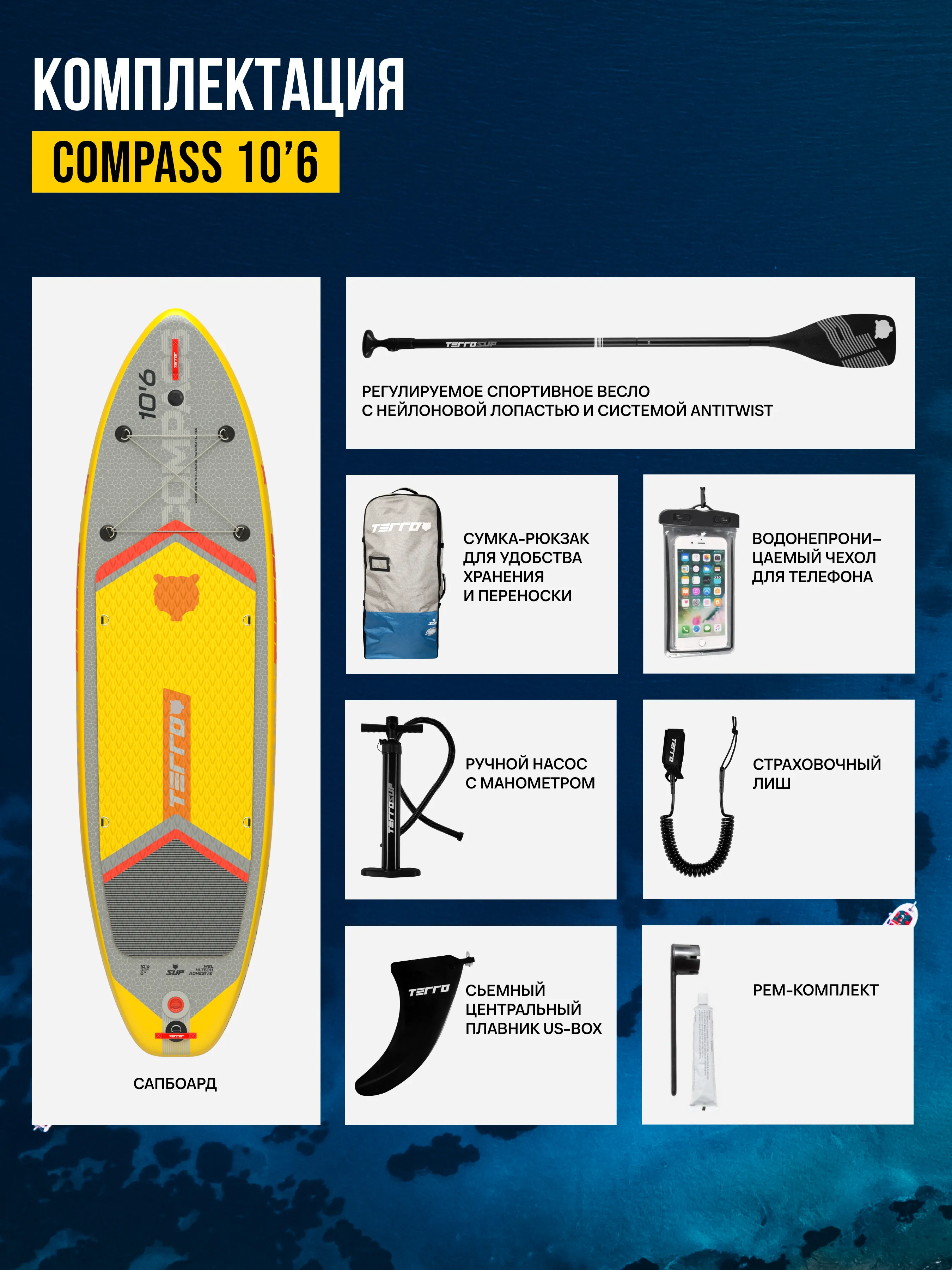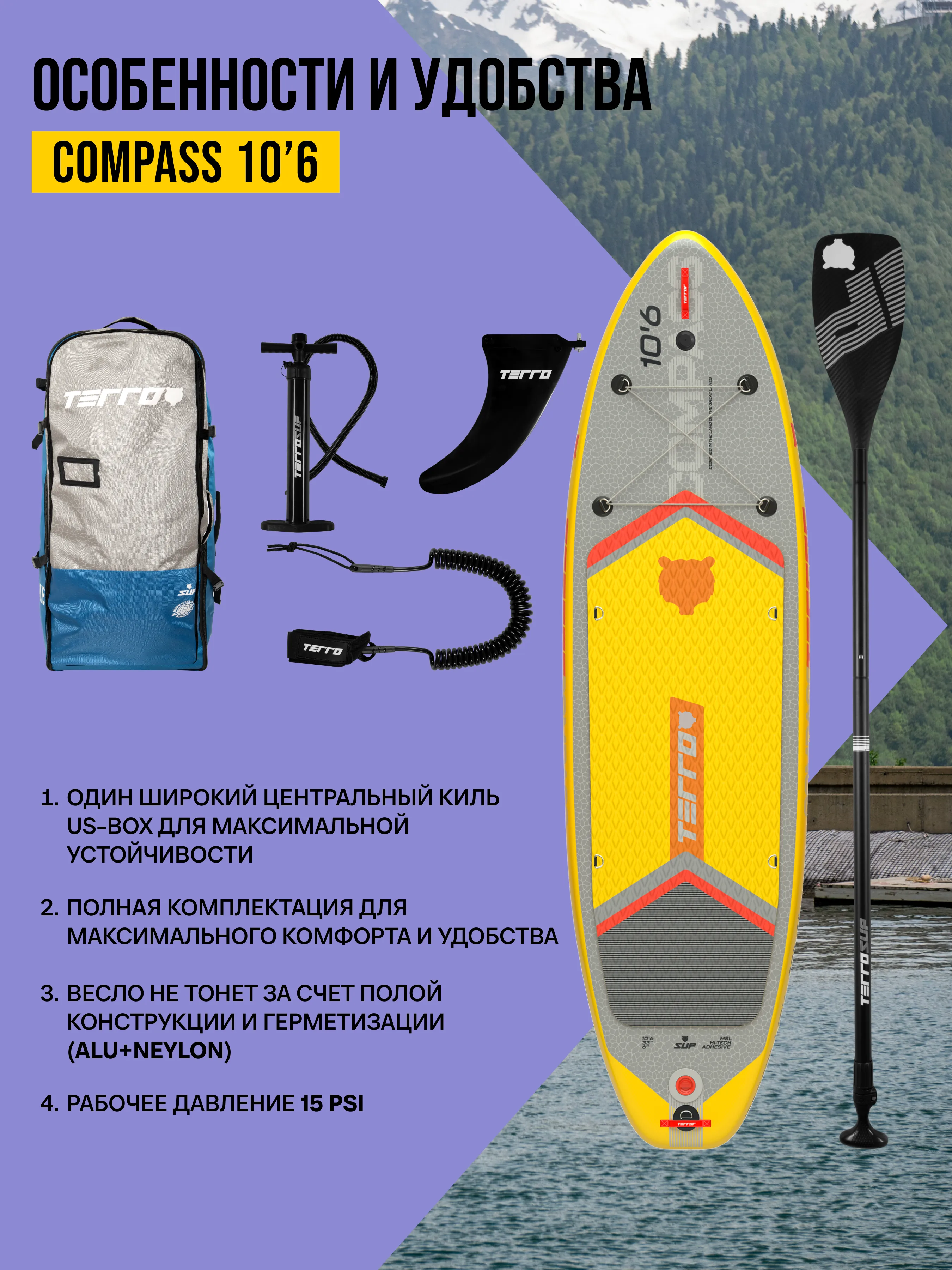 В комплекте: рюкзак, киль, весло, лиш, ручной насос, рем-комплект