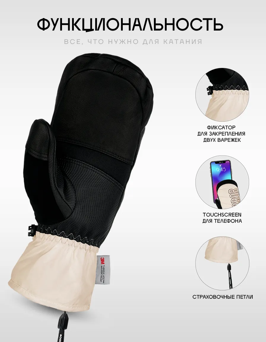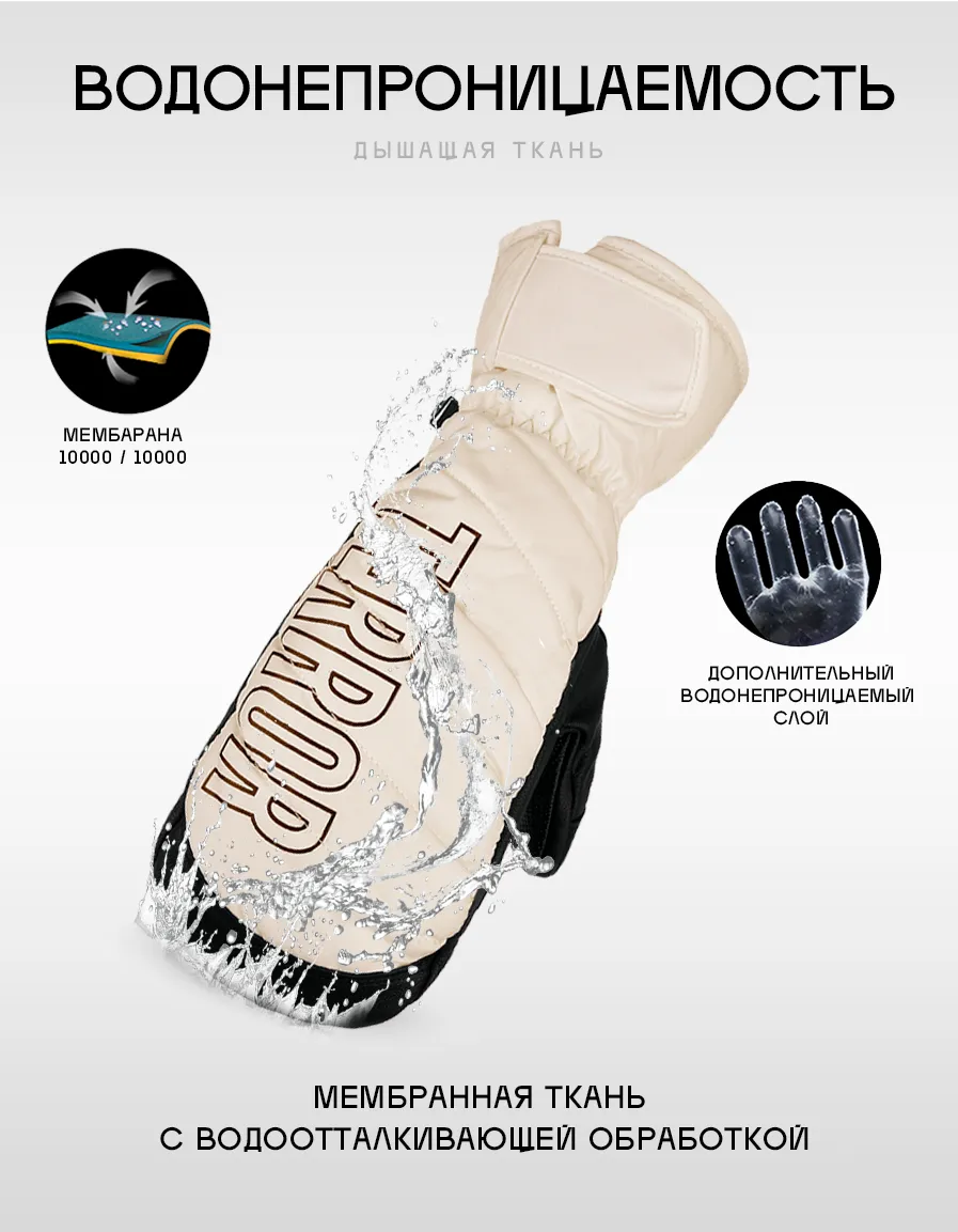 Варежки изготовлены из полиэфирного водонепроницаемого материала с мембраной в 10K, который эффективно предотвращает попадание снега и воды внутрь перчатки. Ладонь изготовлена из смеси противоскользящего полиуретана и настоящей кожи. 3D крой для полного комфорта со внутренним слоем из материала - THINSULATETM. Предоставьте своим рукам комфортные условия во время катания, сухость и тепло в течение длительного времени.