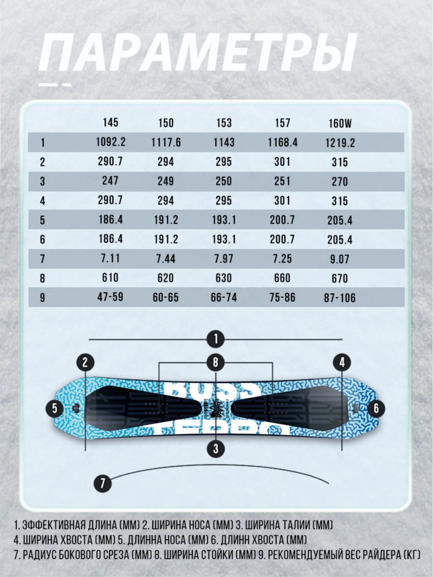Райдеры Terro выбирают асимметричный сноуборд Boss не просто так. Всё дело в том, он удивляет своей динамичностью и стабильностью не только в парке и по трассам, но и за пределами горнолыжного курорта. Оно и не удивительно, ведь в сноуборде BOSS собраны идеальные характеристики! Например, сердечник из тополя с бамбуковыми вставками и карбоновыми стрингерами на носу и тейле; гибридный прогиб Hybrid Camber, улучшающий маневренность в пухляке, и повышающий устойчивость на раскатанном снегу; прочный топшит из пластика PBT, а также спеченный скользяк из высокомолекулярного полиэтилена и, конечно же, разгружающий заднюю ногу ассиметричный шейп.