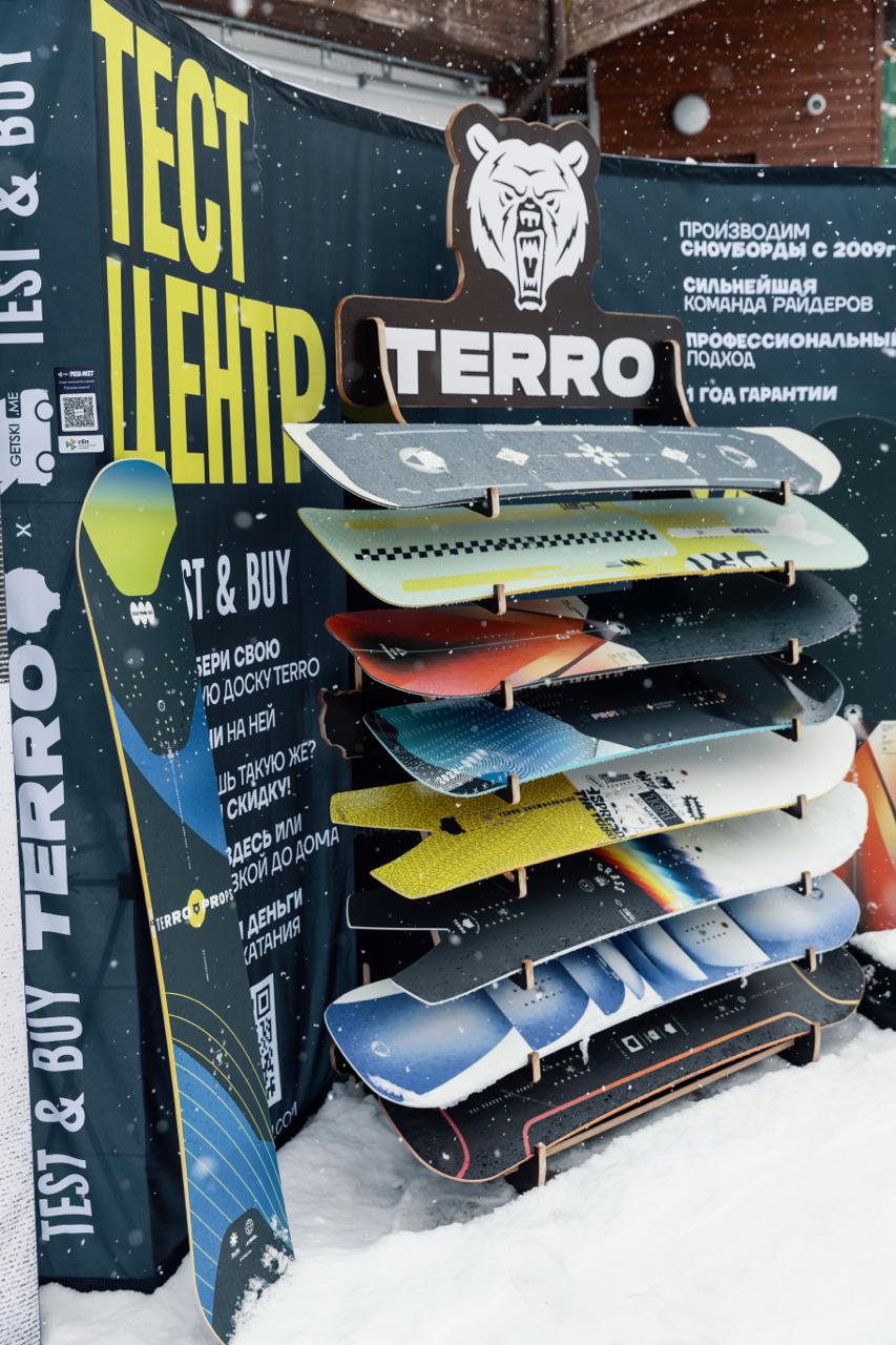 Тест-центры TERRO — это специальные локации, где можно опробовать сноуборды перед покупкой. В них представлены различные модели, доступные для теста прямо на склоне в реальных условиях. Все доски уже оснащены креплениями и полностью готовы к катанию. Во время тестирования вы можете оценить управляемость, жесткость, устойчивость и общий комфорт каждой модели. Это помогает выбрать сноуборд, который подходит именно под ваш уровень и стиль катания. В итоге вы ориентируетесь на свои ощущения и спокойнее принимаете решение.